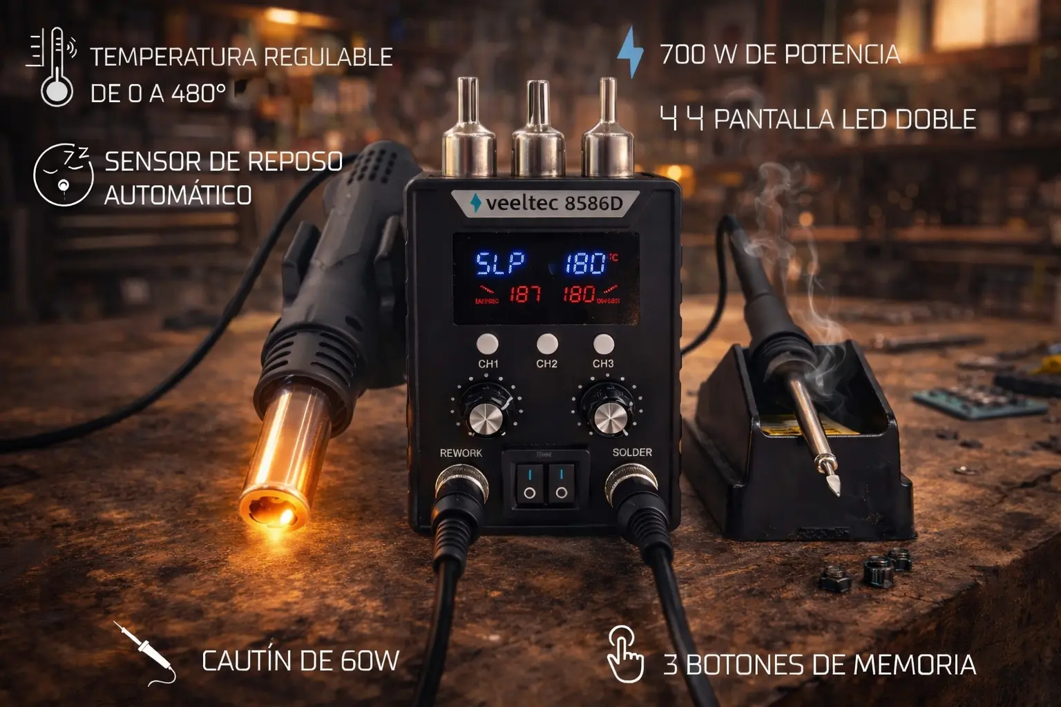 La estación 8586D es una herramienta 2 en 1 que combina soldador de estaño y pistola de aire caliente en un solo equipo compacto, ideal para trabajos de reparación electrónica, soldadura SMD, retrabajo de componentes y mantenimiento técnico. Ofrece control de temperatura digital, alta precisión y facilidad de uso en entornos profesionales y técnicos.