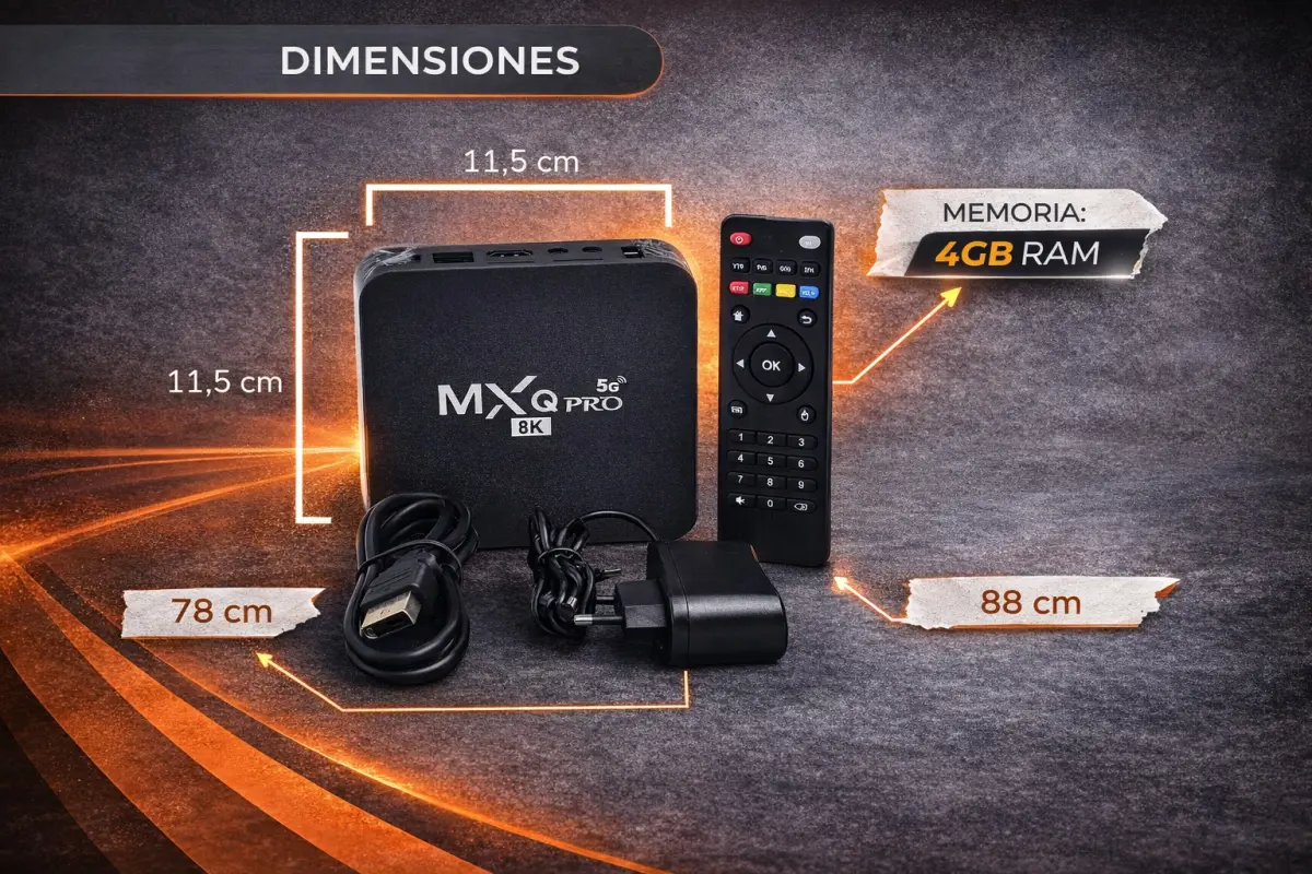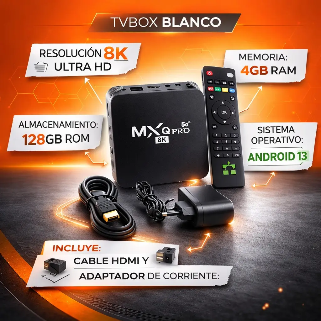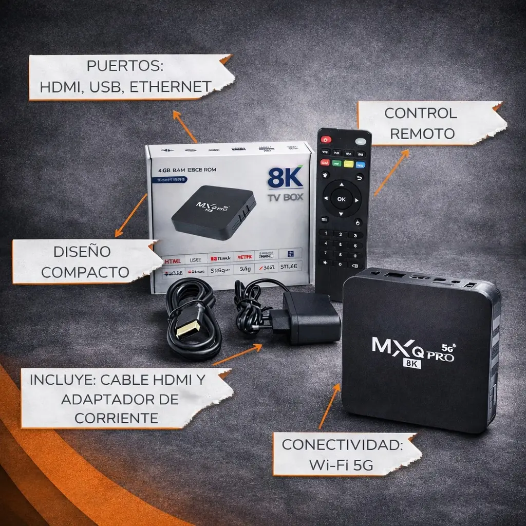 MXQ Pro 5G 8K TV Box – 4GB RAM 128GB ROM Android 13 Transformá tu televisor en un centro de entretenimiento inteligente con el MXQ Pro 5G 8K TV Box. Disfrutá de tus películas, series y videos favoritos con una calidad de imagen asombrosa en resolución 8K Ultra HD. Con 4GB de RAM y 128GB de almacenamiento, y funcionando con Android 13, tendrás velocidad y espacio para todas tus aplicaciones y contenidos.